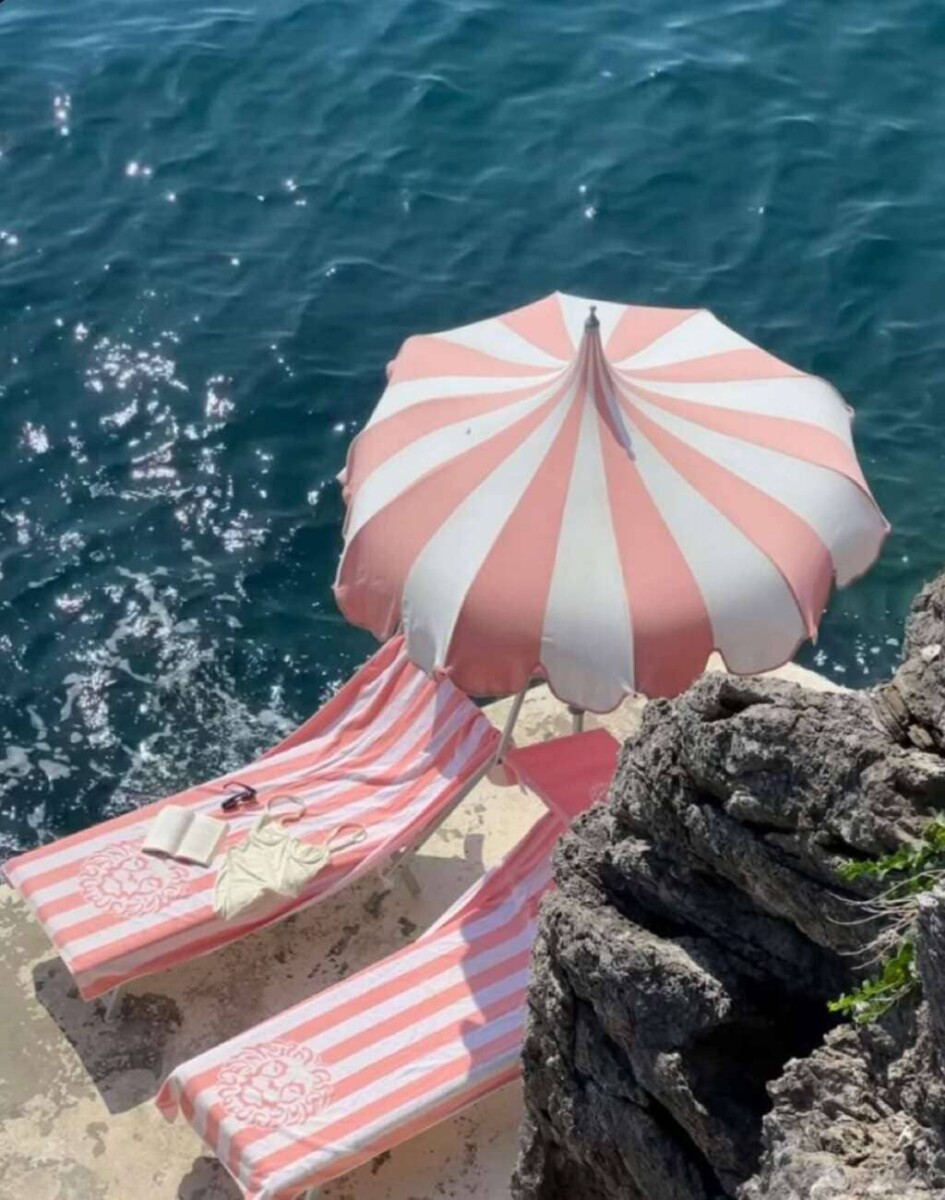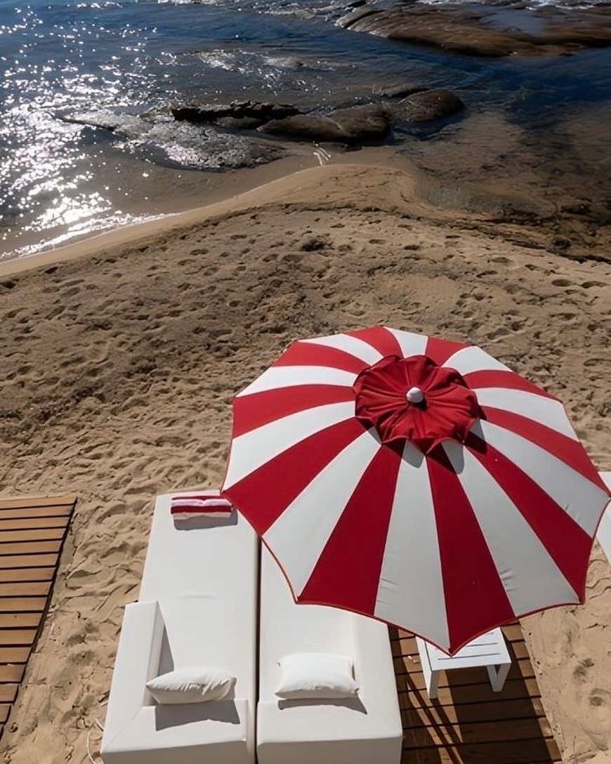 A imagem é uma ode à rebeldia da elegância — uma composição que recusa o óbvio e flerta com o exagero do bom gosto. Espreguiçadeiras de listras amarelas e brancas, perfeitamente alinhadas sob sombrinhas que misturam o retrô europeu com toques boho, criam um cenário que evoca a Riviera Francesa, mas com uma teatralidade solar que surpreende e seduz.