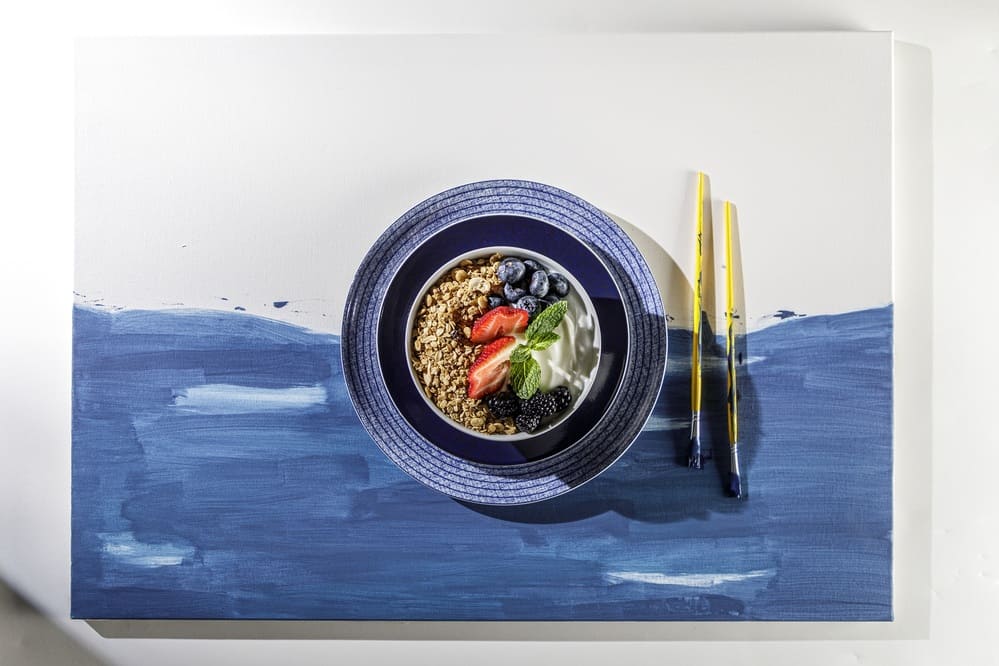 Para quem busca o clássico com um toque moderno, a linha Riva complementa o enxoval. Inspirada no chambray, marca registrada da Trousseau em suas coleções têxteis, a linha oferece peças em porcelana portuguesa com um visual que remete à pintura em aquarela, em irresistíveis tons de azul.