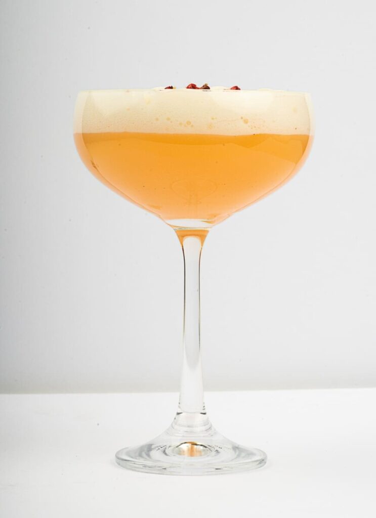 Adicione os ingredientes em uma coqueteleira com gelo, bata bem e sirva duplamente coado em uma taça. Finalize com a espuma de gengibre e decore com pimenta rosa.