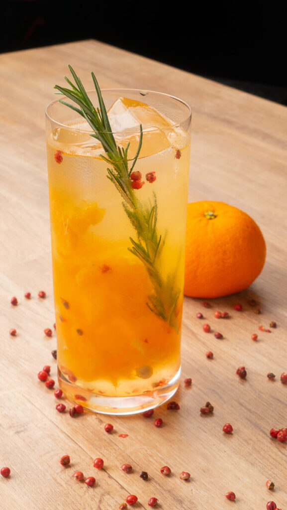 Macere a tangerina com o xarope de açúcar e a pimenta rosa. Complete com gelo, acrescente o sake Azuma e misture bem com uma colher longa. Finalize decorando com o ramo de alecrim.