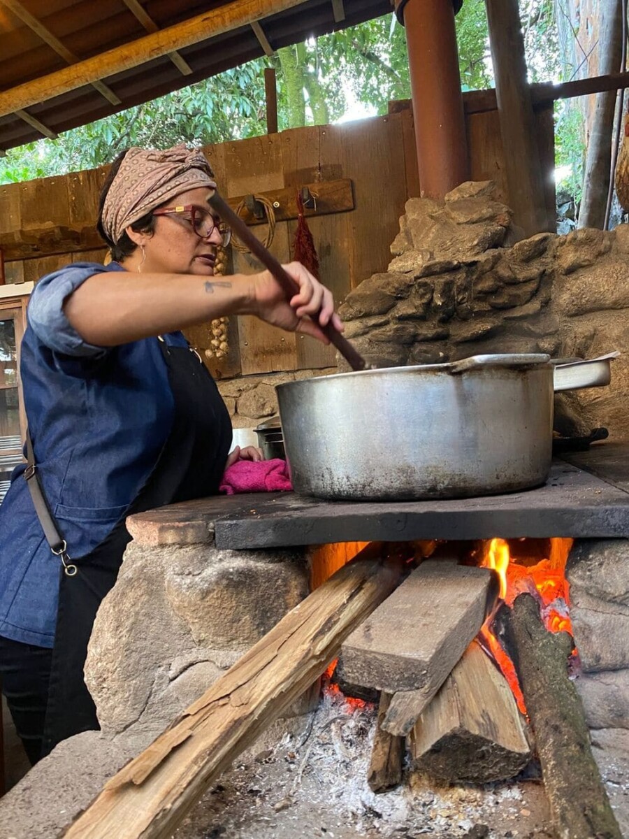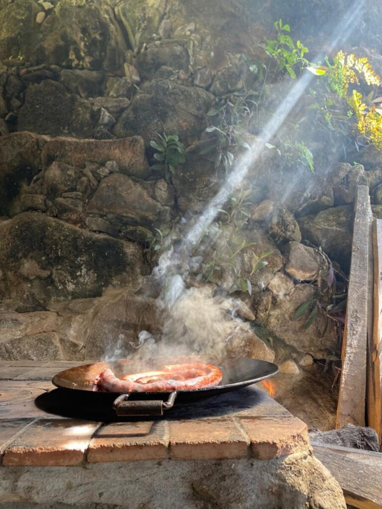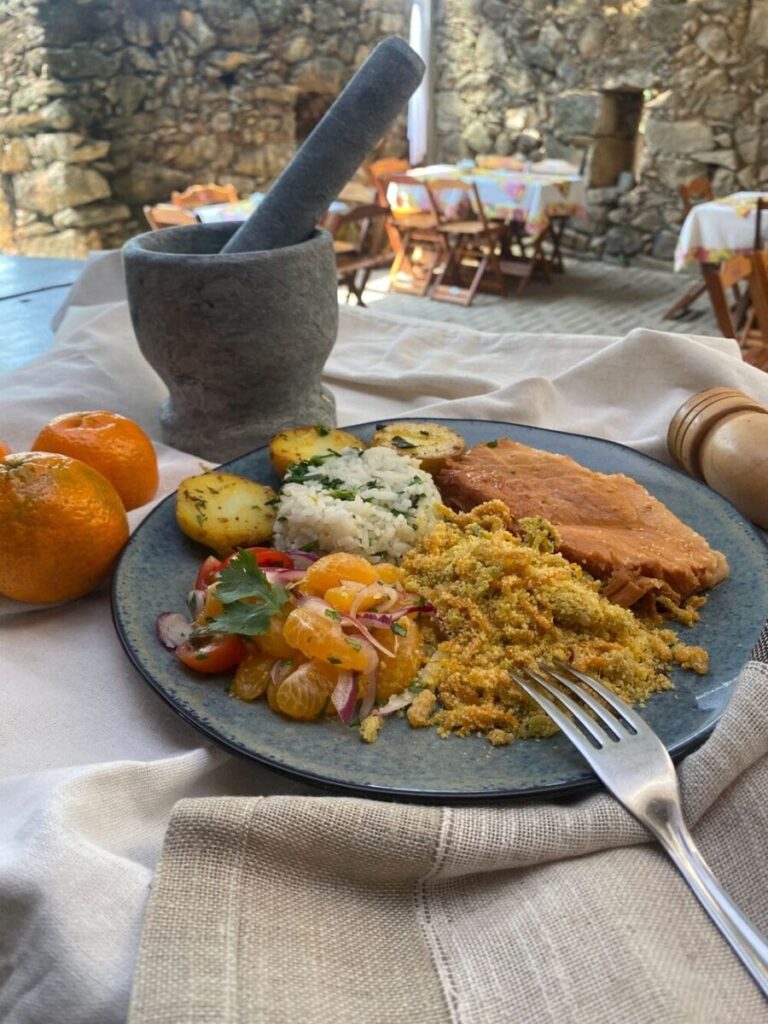 Tudo é experiência: da cozinha viva ao ar livre, onde um fogão à lenha feito de pedras esquenta receitas e corações, até o salão interno montado dentro das ruínas, onde objetos antigos, descobertos durante a reforma, ganham nova vida e contam histórias silenciosas entre garfadas e goles.