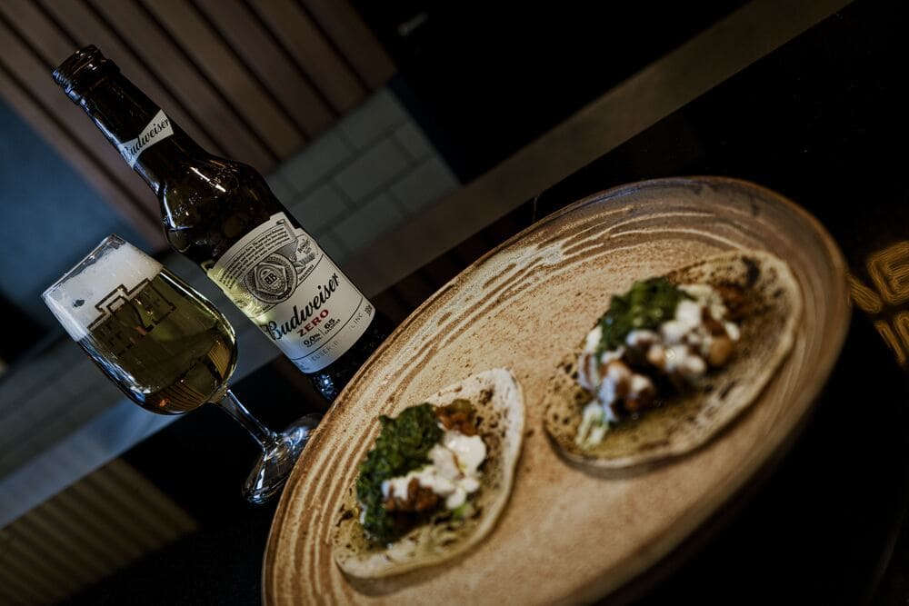 A autêntica American Lager zero álcool, Budweiser Zero, harmoniza tanto por similaridade quanto por cultura com a culinária TEX-MEX. O prato da chef é composto por Taco de Macaxeira Pubada, Chili com Carne, Coalhada e Salsa Verde.