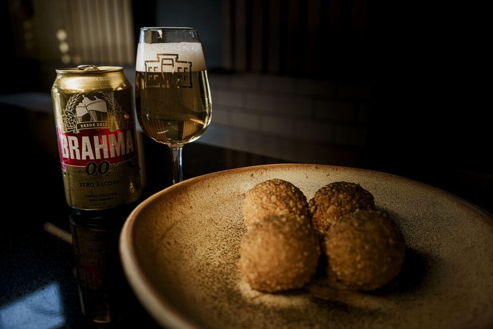 Um clássico de boteco ganha requinte e é elevado à categoria da harmonização por similaridade. A Brahma 0,0% combina com o Bolinho de Macaxeira Pubada, Queijo do Reino, Bernaise de Tucupi e Cinza da Folha de Mandioca.