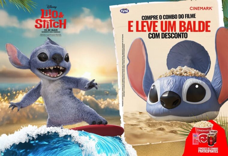 A pré-venda do combo com o balde de pipoca exclusivo já está liberada no site e app da Rede, e quem é cliente do Cinemark Club ainda garante um descontinho especial. O balde, no formato da cabeça do Stitch, é o tipo de mimo que dá vontade de guardar para sempre. Já o combo com o copo personalizado do personagem estará disponível a partir de 22 de maio — justamente na data de estreia do filme nos cinemas.