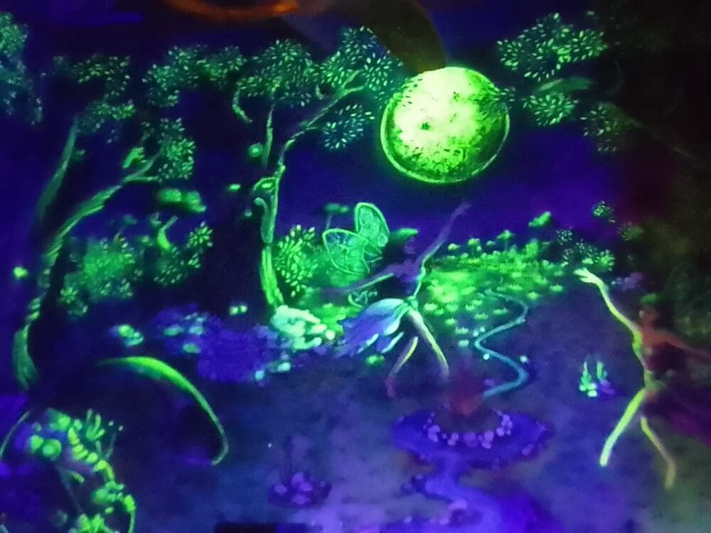 As pinturas revelam outra leitura quando a luz negra entra em cena: formas, traços e cores emergem como se saíssem da parede, criando um jogo visual que transforma o ambiente conforme a noite avança. É como se o espaço tivesse duas versões de si — uma visível e outra que se revela apenas ao olhar atento.