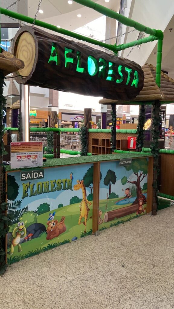 Instalada na Praça de Alimentação, a Floresta Encantada é uma atração inédita na cidade. Com mais de 150 m², o espaço traz uma cenografia lúdica inspirada na fauna e flora brasileiras. Entre escorregadores, pula-pula, esculturas de animais e uma gigantesca piscina com mais de 100 mil bolinhas, o ambiente foi cuidadosamente projetado para estimular a criatividade, a socialização e o movimento em um cenário mágico e acolhedor.