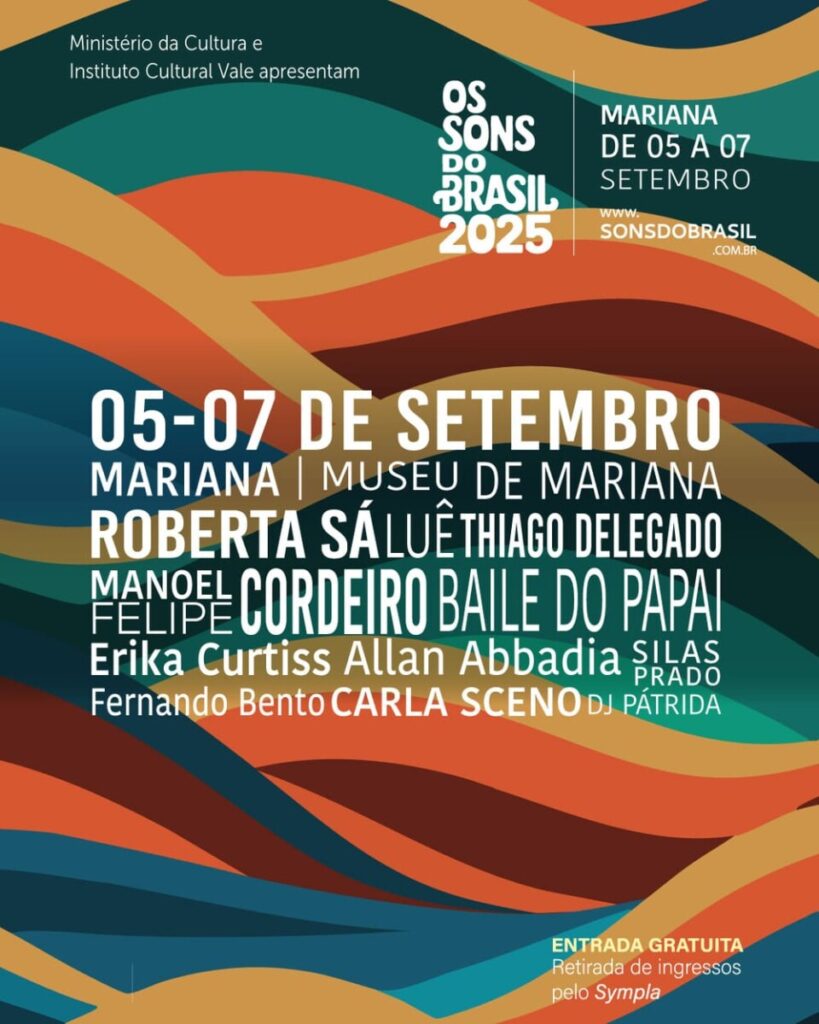 “Imagine uma onda que não vem do mar, mas do tambor. Uma corrente de som que atravessa o corpo, estremece o chão e colore o ar”. É com esse sentimento que o Festival Os Sons do Brasil retorna à região dos Inconfidentes com uma programação potente, diversa e gratuita. Entre os dias 29 e 31 de agosto, o evento ocupa o Museu Boulieu, em Ouro Preto, e segue para o Museu de Mariana entre os dias 5 e 7 de setembro, celebrando a pluralidade sonora que marca a música brasileira.