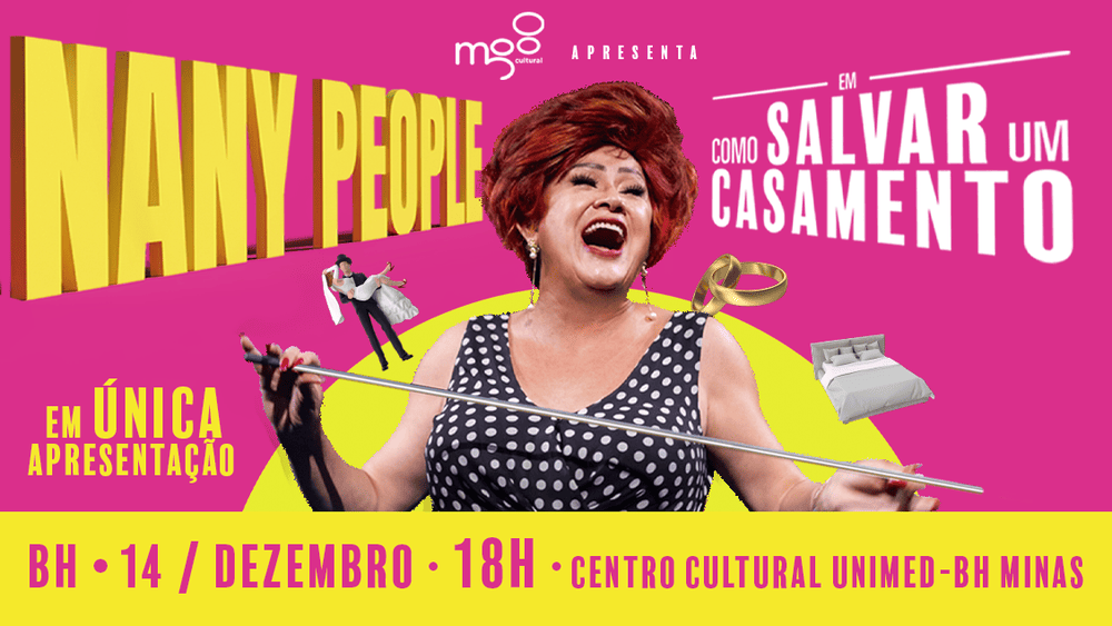 A mineira mais irreverente dos palcos, Nany People, retorna a Belo Horizonte para apresentar seu mais novo espetáculo de solo cômico: “Como Salvar Um Casamento”. A peça, que promete risadas e reflexões sobre a vida a dois — e a um só —, será encenada no dia 14 de dezembro (domingo), às 18h, no Centro Cultural Unimed-BH Minas.