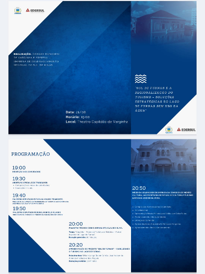 O secretário estará por dois dias em Varginha, no dia 21, durante o período da manhã e tarde participa de reunião na secretaria de Turismo da cidade e na Câmara dos Vereadores, e às 19 h participa no Theatro Capitólio de Varginha do evento projeto “ Sol de Furnas e a Regionalização do Turismo- Soluções em Estratégicas do Lago de Furnas Sem Uso da Água “da solenidade da Comenda do Mérito Cultural concedida pela Câmara dos Vereadores de Varginha.
